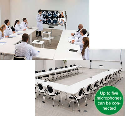 - Solusi scalable dan fleksibel yang sangat baik untuk ruang pertemuan besar dengan konfigurasi meja khusus, dapat menghubungkan hingga 5 mikrofon secara daisy chain dan mendukung 2 speaker eksternal