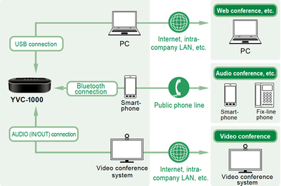 Hubungkan ke YVC-1000 melalui USB, Bluetooth*1, atau terminal audio*2 dari sistem konferensi untuk mendapatkan audio berkualitas tinggi dalam konferensi dan pertemuan Anda. Dengan berbagai opsi koneksi, Anda dapat beradaptasi dengan berbagai lingkungan komunikasi secara cepat, serta situasi di mana konferensi mungkin sulit dilakukan karena tidak adanya sambungan telepon rumah, atau masalah konektivitas internet.