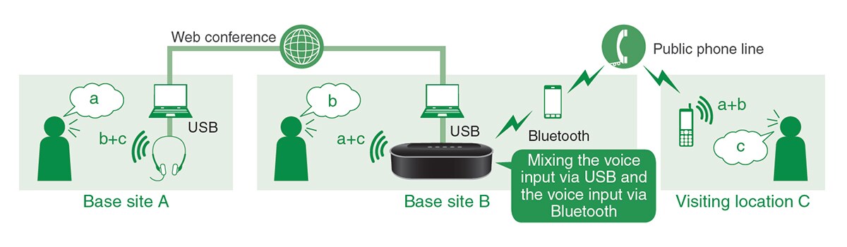 Fungsi mixing audio melakukan mixing beberapa sumber input suara yang terhubung ke masing-masing koneksi antarmuka (USB, Bluetooth, dan input/output audio) yang memungkinkan komunikasi bersamaan melalui jalur yang berbeda. Misalnya, saat terhubung ke konferensi web melalui USB, Anda juga dapat menyertakan lebih banyak peserta melalui smartphone menggunakan koneksi Bluetooth, dengan menggunakan fungsi mixing audio untuk mengombinasikan sumber audio.