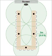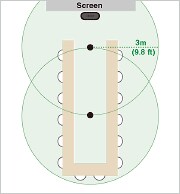 Untuk konfigurasi "Mikrofon x 3" dan "Mikrofon x 5" yang ditunjukkan di atas, kualitas audio lebih unggul dalam konfigurasi "Mikrofon x 5" karena mikrofon diposisikan lebih dekat ke peserta pertemuan.