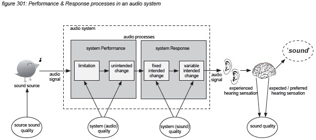 Summarizing: a hearing sensation is invoked when an audio signal - generated by a sound source - reaches a listener through an audio system. The sound quality experienced by a listener depends on the source sound quality of the generated audio signal, limited and unintentionally changed by the Performance and intentionally changed by the Response of the audio system. This arrangement is equivalent to the formula presented in chapter 1.6.
