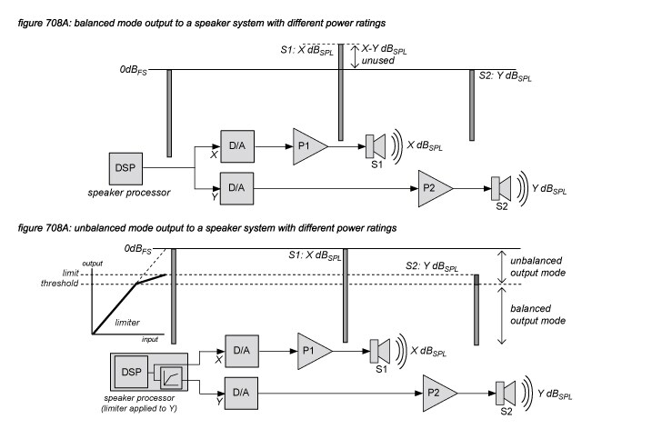 To illustrate how clip level mismatches cause the dynamic range to be decreased, figure 706 a, b and c present the connection of the analogue input of three different power amplifiers to a Yamaha DME24N analogue output, with different clip levels of the power amplifiers input as listed in table 701.