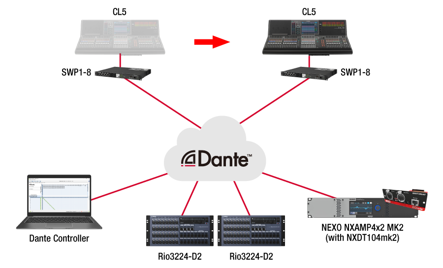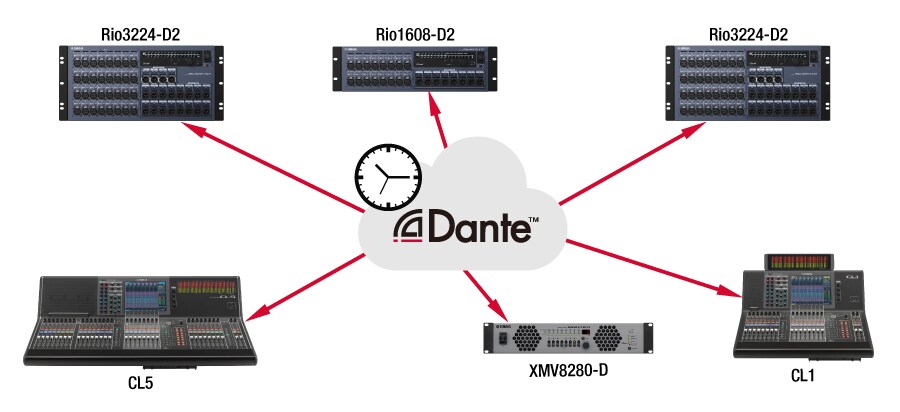Seluruh jaringan Dante bertindak sebagai master clock, jadi tidak perlu memikirkan hubungan master/slave dalam jaringan.