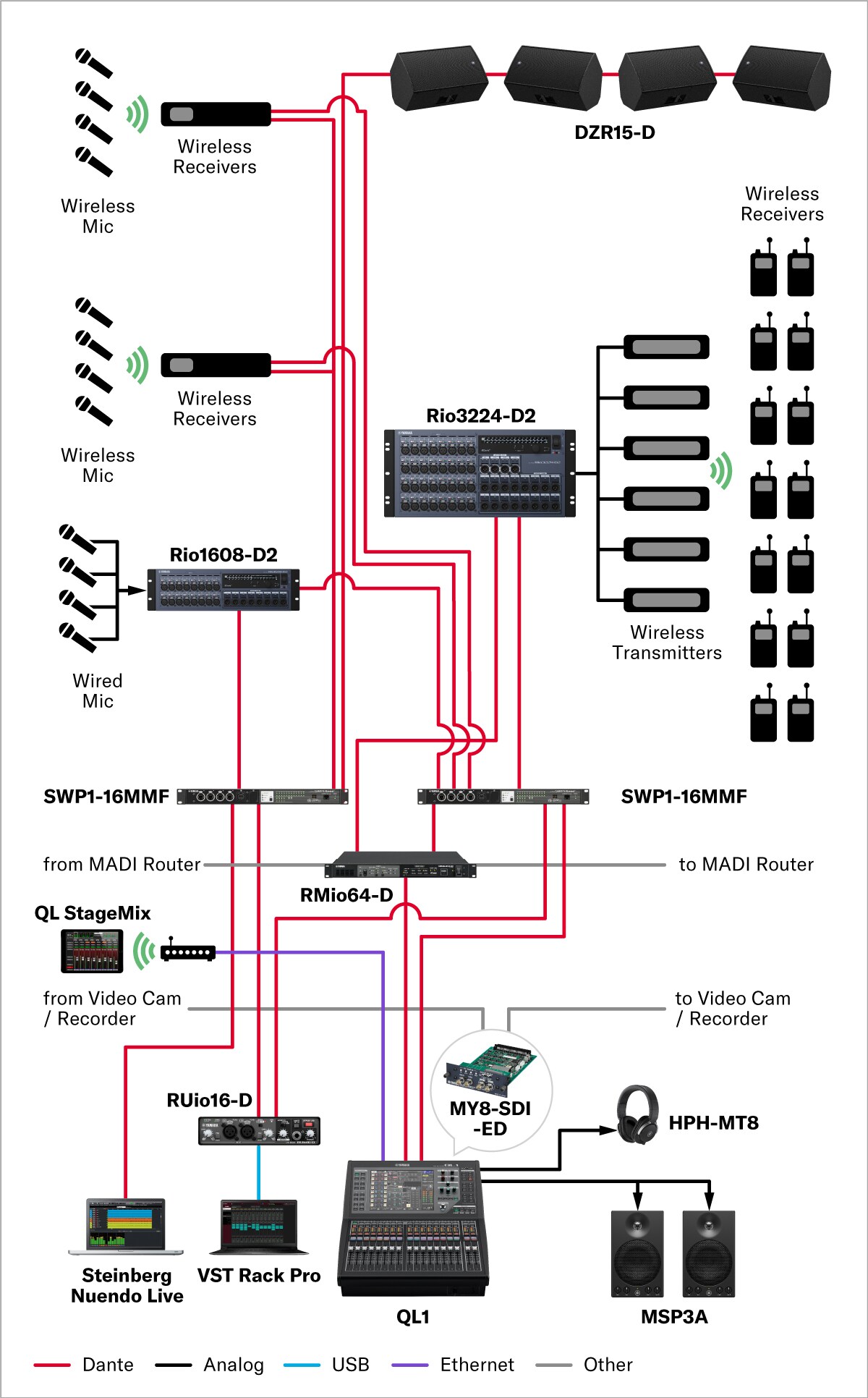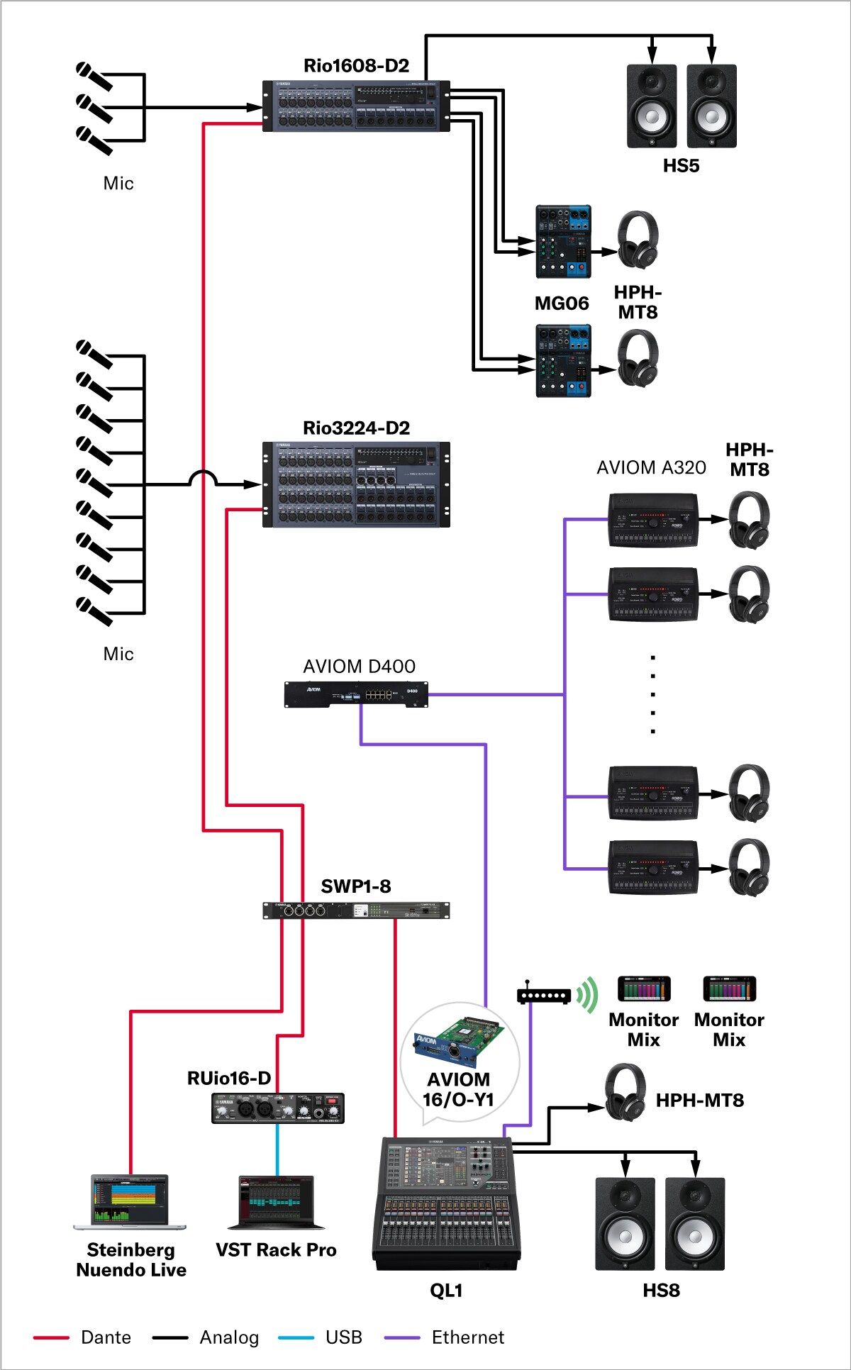 Ini adalah sistem untuk rekaman musik dan suara. Dari pengaturan mikrofon tunggal hingga recording puluhan channel secara bersamaan, peralatan dan perangkat lunak Yamaha memungkinkan Anda mengkonfigurasi sistem yang sesuai dengan tujuan, skala, dan anggaran Anda. Dengan memanfaatkan jaringan audio seperti Dante, pengkabelan dapat disederhanakan secara signifikan tanpa mengorbankan kualitas suara.