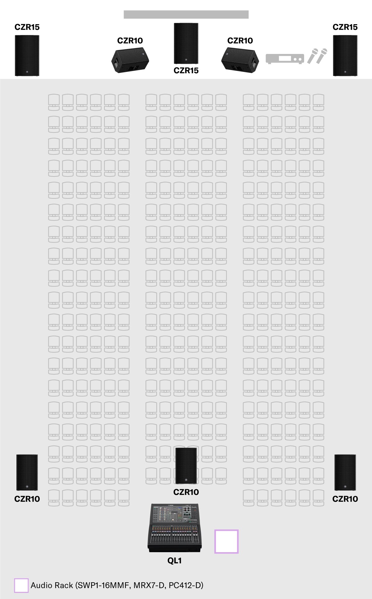 • Membangun sistem yang berpusat pada mixer yang kompatibel dengan Dante juga memungkinkan dukungan fleksibel untuk tempat seperti auditorium. CZR series menawarkan kualitas suara tinggi, mempunyai output besar, serta memungkinkan rotasi horn untuk jangkauan optimal di pemasangan secara vertikal maupun horizontal. Power amplifier PC-D series dilengkapi dengan preset CZR series untuk memudahkan konfigurasi pengaturan DSP ideal.