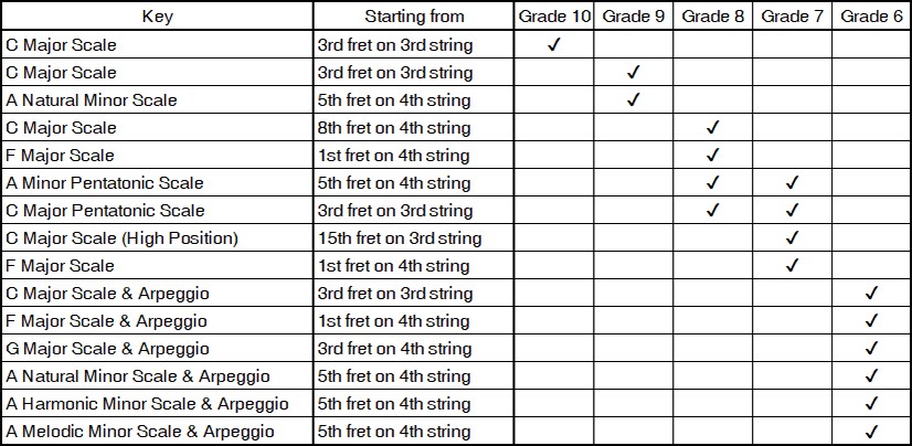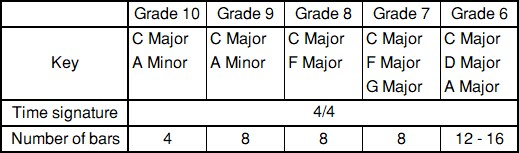 Peserta ujian memainkan satu (Grade 10, 9), dua (Grade 8-6) tangga nada yang dipilih oleh penguji tanpa menggunakan partitur.
