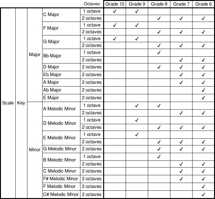 Peserta ujian memainkan satu (Grade 10), dua (Grade 9-6) tangga nada yang dipilih oleh penguji tanpa menggunakan partitur.