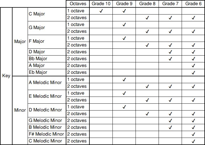 Peserta ujian memainkan satu (Grade 10), dua (Grade 9-6) tangga nada yang dipilih oleh penguji tanpa menggunakan partitur.