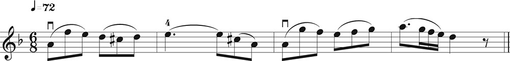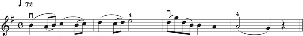 4. Grade 13, 12: Peserta ujian memainkan tangga nada yang sama pada kunci yang sama dengan prosedur 1 dengan menggunakan bowing variation yang diberikan.
