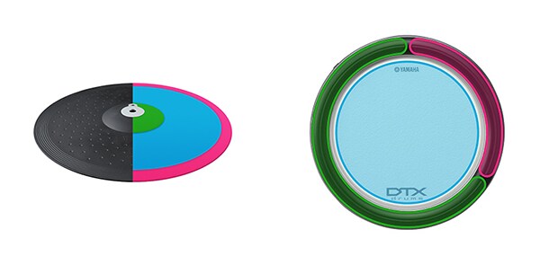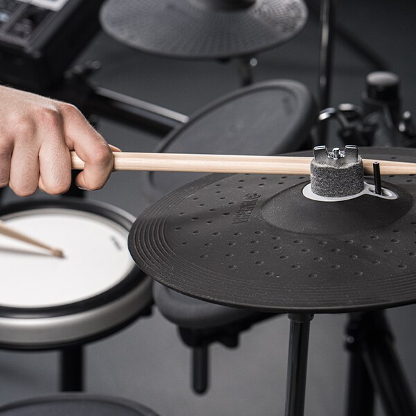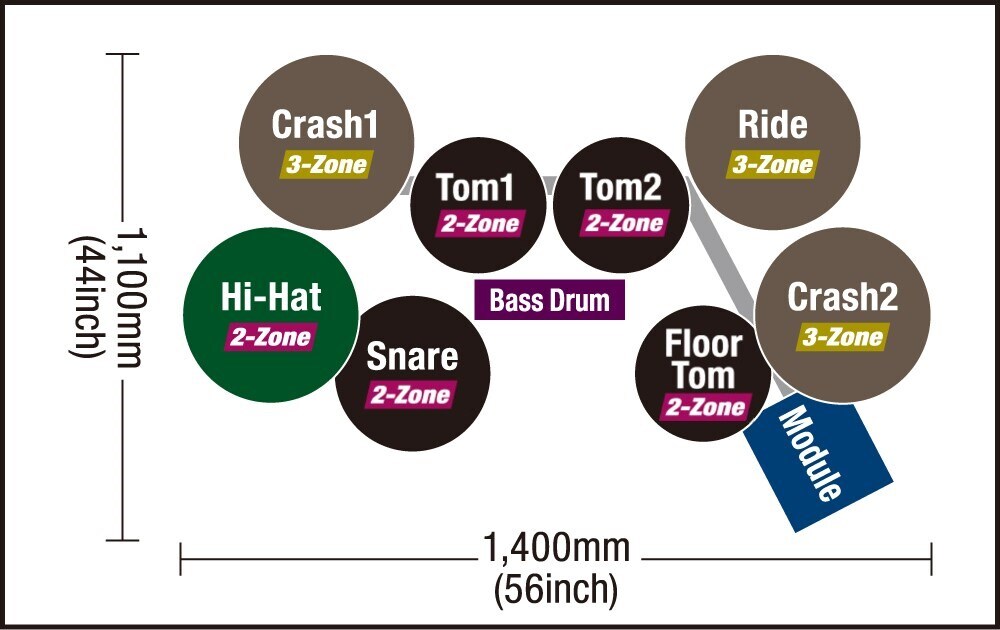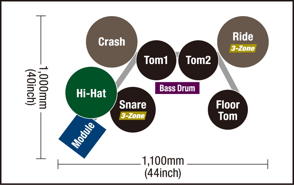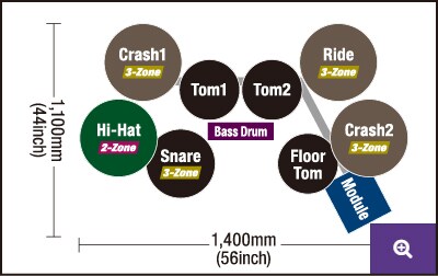 - Pad 3-zona untuk snare, crash, dan ride. Cymbal dapat di-choke dan di-mute. Ride cymbal dilengkapi dengan fungsi deteksi titik pukulan (positional sensing)
