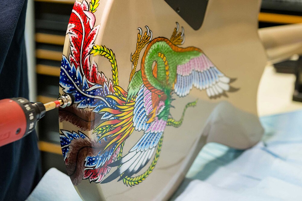 “Saya mendapatkan sejumlah ide yang menggunakan gambar harimau dan topeng setan Jepang, tetapi pada akhirnya saya memilih menggunakan naga dan burung phoenix," kata Hiro. “Logo Yamaha mengingatkan saya pada phoenix, yang merupakan tema sempurna untuk hubungan baru saya dengan perusahaan tersebut, dan menggabungkan warisan budaya kami sama.”