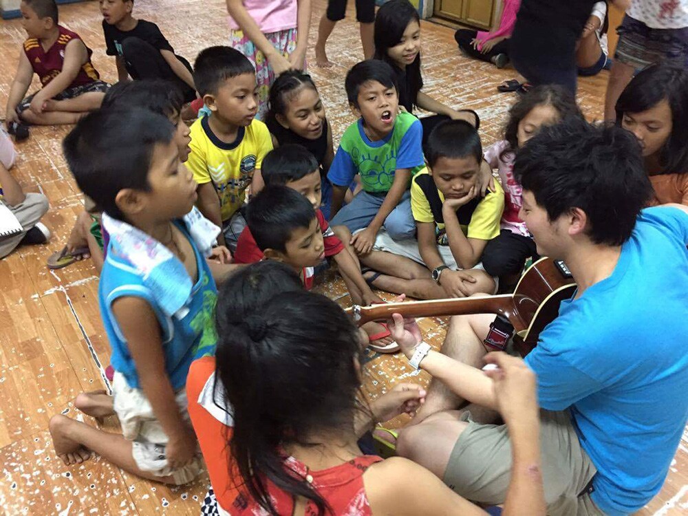 Di Filipina, saya mengajak anak-anak berpartisipasi dalam lokakarya penulisan lagu sebagai bagian dari proyek musik WORLD FESTIVAL LABEL kami. Kami bertanya kepada mereka tentang negara, keluarga, impian, cinta, dan mengubahnya menjadi kumpulan lirik dan melodi, lalu menyanyikannya dengan iringan gitar. Kami merekam dan mengerjakannya menjadi sebuah lagu. Semuanya tidak mungkin dilakukan tanpa gitar.