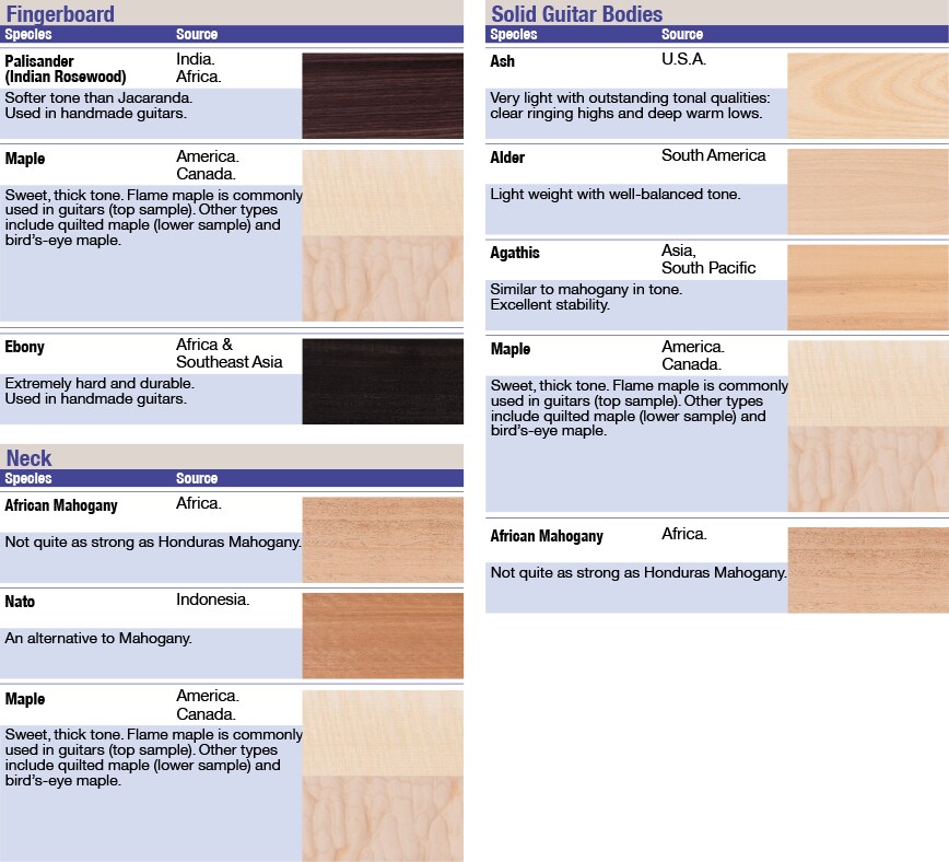 Agar tidak memuntir atau melengkung, jenis-jenis kayu yang keras dan padat digunakan untuk membuat neck: mahoni, rosewood, nato, padauk, dan terkadang maple. Neck dapat diukir dari sepotong kayu, atau dari beberapa bagian yang digabungkan untuk menambah kekuatan dan kekakuan. Yamaha mengombinasikan mahoni dengan rosewood, padauk, atau eboni untuk neck three piece atau five piece yang memadukan kekuatan dan sifat suara dari kayu yang berbeda untuk mendapatkan hasil yang diinginkan.