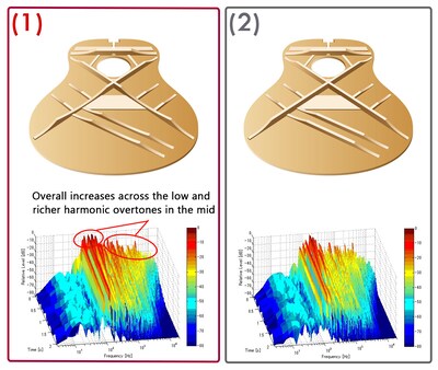FG yang baru memiliki suara yang lebih keras dan lebih kuat di kisaran rendah hingga menengah, berkat teknologi analisis akustik canggih yang dikembangkan oleh Divisi R&D Yamaha. Para engineer Yamaha telah mencapai suara ini dengan memanfaatkan analisis dan simulasi untuk sampai pada desain penjepit terbaik tanpa bergantung pada tradisi atau dugaan. Analisis ini mengarah pada pengembangan pola penjepit bergigi baru, struktur akustik yang baru dan ideal yang mempertahankan daya tahan papan atas sekaligus menghasilkan suara paling banyak yang ditawarkan Yamaha FG.