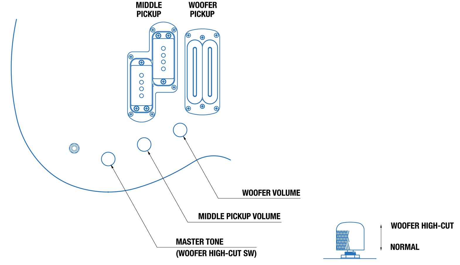 | Pengaturan | Woofer P.U. Volume, Middle P.U. Volume, Master Tone with Woofer P.U. High Cut Switch | ||