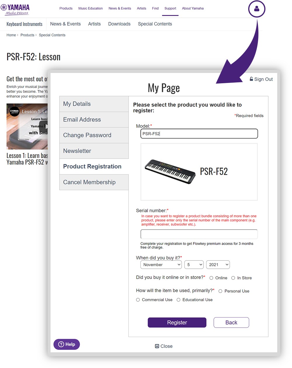 Kami akan mengirimkan serangkaian email kepada pengguna PSR-F52 yang mendaftarkan keyboard mereka. Email ini akan berisi tautan video pelajaran yang menunjukkan cara memainkan lagu di Song Book menggunakan fungsi Smart Chord. Silakan lihat pemberitahuan berikut sebelum mendaftar. Kami berencana mengirim video pelajaran pertama pada akhir tahun 2021 atau awal tahun 2022.