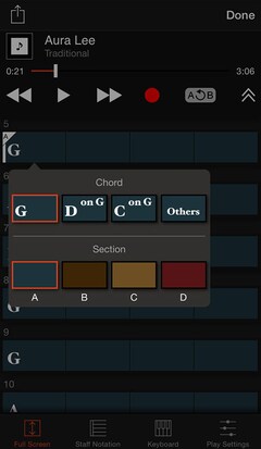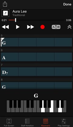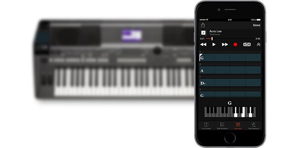 Menghubungkan perangkat Anda ke alat musik memungkinkan Anda mengirimkan pemutaran audio lagu ke alat musik yang didukung sehingga dapat mendengarkan melalui speaker alat musik. Aplikasi Chord Tracker juga akan mentransfer informasi chord ke alat musik. Anda bahkan dapat merekam permainan di perangkat dalam bentuk file audio dan membagikannya kepada orang lain melalui email (format AAC atau WAV).
