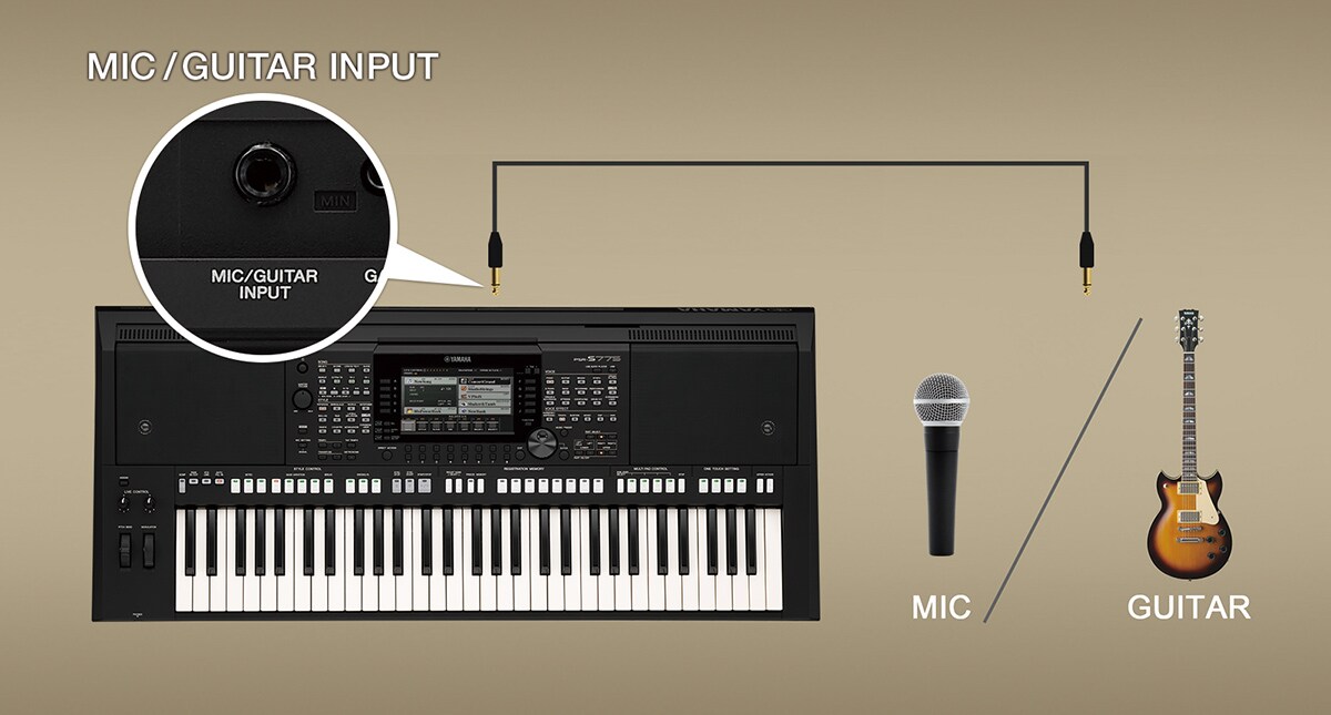 PSR-S775 hadir dengan dilengkapi input Mic/Guitar yang membuat Anda dengan mudah menambahkan suara vokal atau gitar dalam sebuah penampilan live. Hanya dengan menghubungkan sebuah mikrofon, maka Anda dengan mudah dapat memberikan berbagai macam efek PSR ke dalam vokal. Atau, hubungkan sebuah gitar dan sesuaikan parameternya dengan preferensi Anda dan tiru suara artis favorit Anda atau ciptakan suara yang Anda sukai!