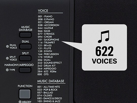 PSR-E373 dilengkapi fitur generator nada LSI yang baru dikembangkan, yang telah disempurnakan secara menakjubkan dari segi kualitas suara serta efek kualitas tinggi. Berkat LSI baru ini, Anda dapat menikmati koleksi lengkap 622 Voice alat musik yang sempurna untuk dimainkan dalam aliran musik apa pun yang dipilih, serta Super Articulation Lite Voice unik yang mereproduksi getar dan derau senar dari alat musik bersenar seperti cello dan mandolin—yang sebelumnya sulit ditiru— dengan realisme yang luar biasa, untuk pertunjukan yang luar biasa autentik.