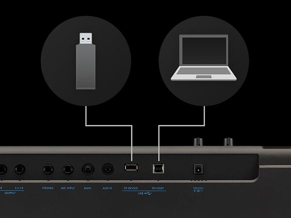 Berbagai pilihan konektivitas menyediakan semua dukungan yang Anda butuhkan untuk berlatih, bermain, dan tampil. Colokkan mikrofon untuk mencoba bernyanyi sambil bermain, gunakan aplikasi Rec'n'Share untuk berbagi musik Anda dengan dunia, dan hubungkan ke sistem PA untuk tampil di atas panggung.