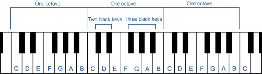 Seperti ditunjukkan dalam diagram, hamparan keyboard piano terdiri dari susunan tuts putih dan tuts hitam yang teratur. Menekan tuts akan menghasilkan suara. Dalam diagram, tuts putih ditandai dengan nama nya sesuai alfabet musik dan dengan nama nada mereka.