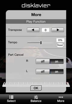Disklavier Controller lets you use your smartphone to configure or alter settings intuitively for listening, such as transposing a tune, changing its tempo, or adjusting its balance.Disklavier Controller allows you to set or change the following functions. -Volume balance with sound source -Transposition -Song playback tempo -Part canceling (switching the left- or right-hand parts on and off)