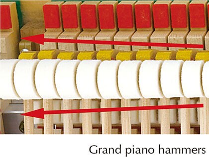 Saat memainkan piano digital, area belakang tuts mungkin terbukti menjadi tantangan tersendiri untuk ekspresi musik yang lengkap. Alasannya karena bagian belakang tuts paling dekat dengan titik tumpu aksi. Semakin dekat tuts yang Anda ketuk dengan titik pivot ini maka semakin sedikit bobot yang Anda dapatkan dan semakin banyak tenaga yang digunakan. Semakin besar panjang tuts GrandTouch akan memberi SEMAKIN BANYAK bobot bagi pemain, yang memungkinkan pengendalian ekspresif yang lebih baik, bahkan di bagian belakang tuts. Panjang penopang ini sama seperti yang ada pada grand piano premium Yamaha S3X (per April 2017), dan merupakan penopang terpanjang yang digunakan pada piano digital mana pun.