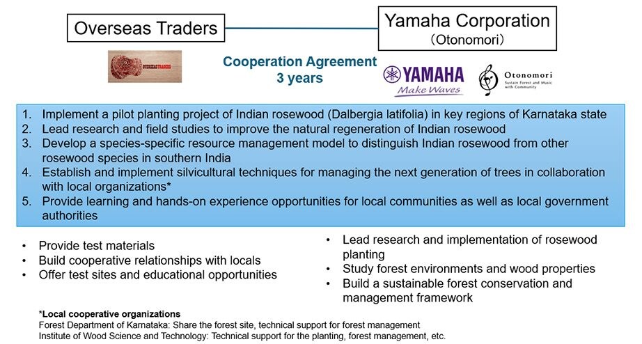 Melalui kemitraan ini, Yamaha dan Overseas Traders akan bekerja sama mengembangkan rantai pasokan kayu rosewood India yang berkelanjutan bagi kedua perusahaan, yang meliputi sejumlah proses mulai dari hutan sampai dengan produk jadi, serta berkolaborasi dalam penelitian dan pengembangan terkait konservasi hutan untuk spesies kayu tersebut.
