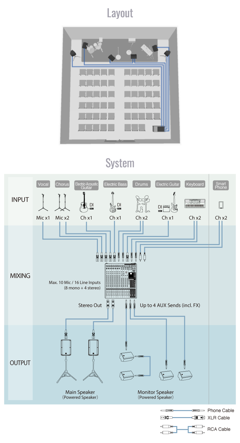 Sistem ini terdiri atas konsol mixing analog 16-channel, 2x speaker aktif, dan 3x powered speaker untuk pemantauan.